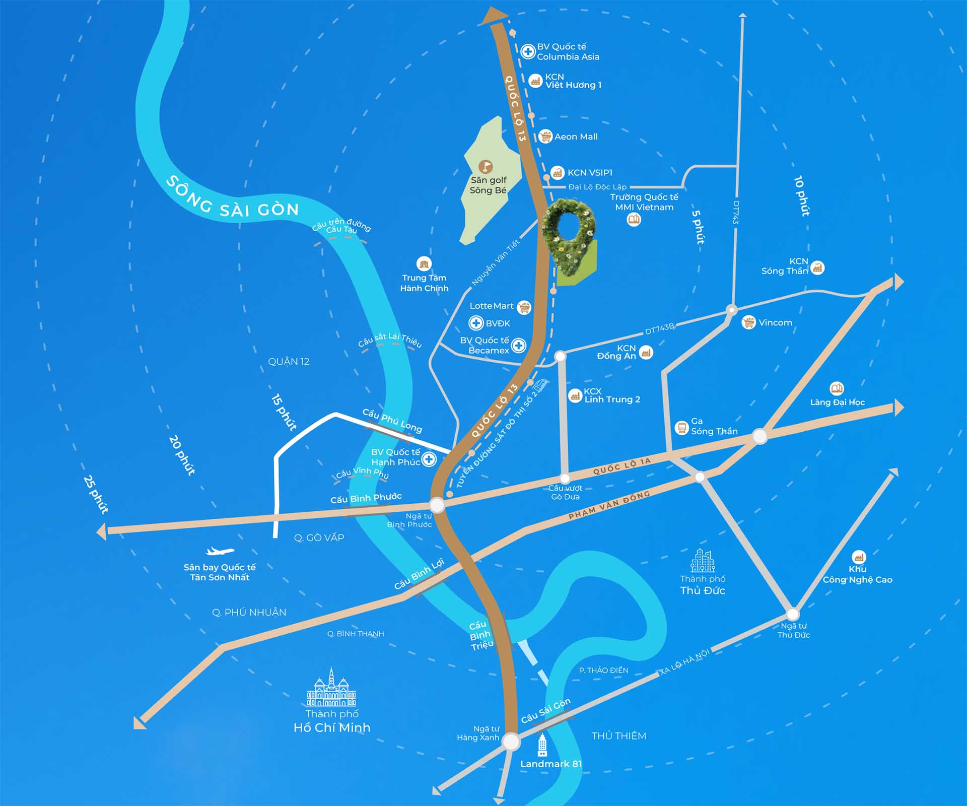 Đồng thời, đoạn QL 13 qua TP.HCM cũng sẽ được mở rộng lên 60m - 8 làn xe (khởi công trong năm 2025 và thông xe vào lúc căn hộ được bàn giao 2027 - 2028)